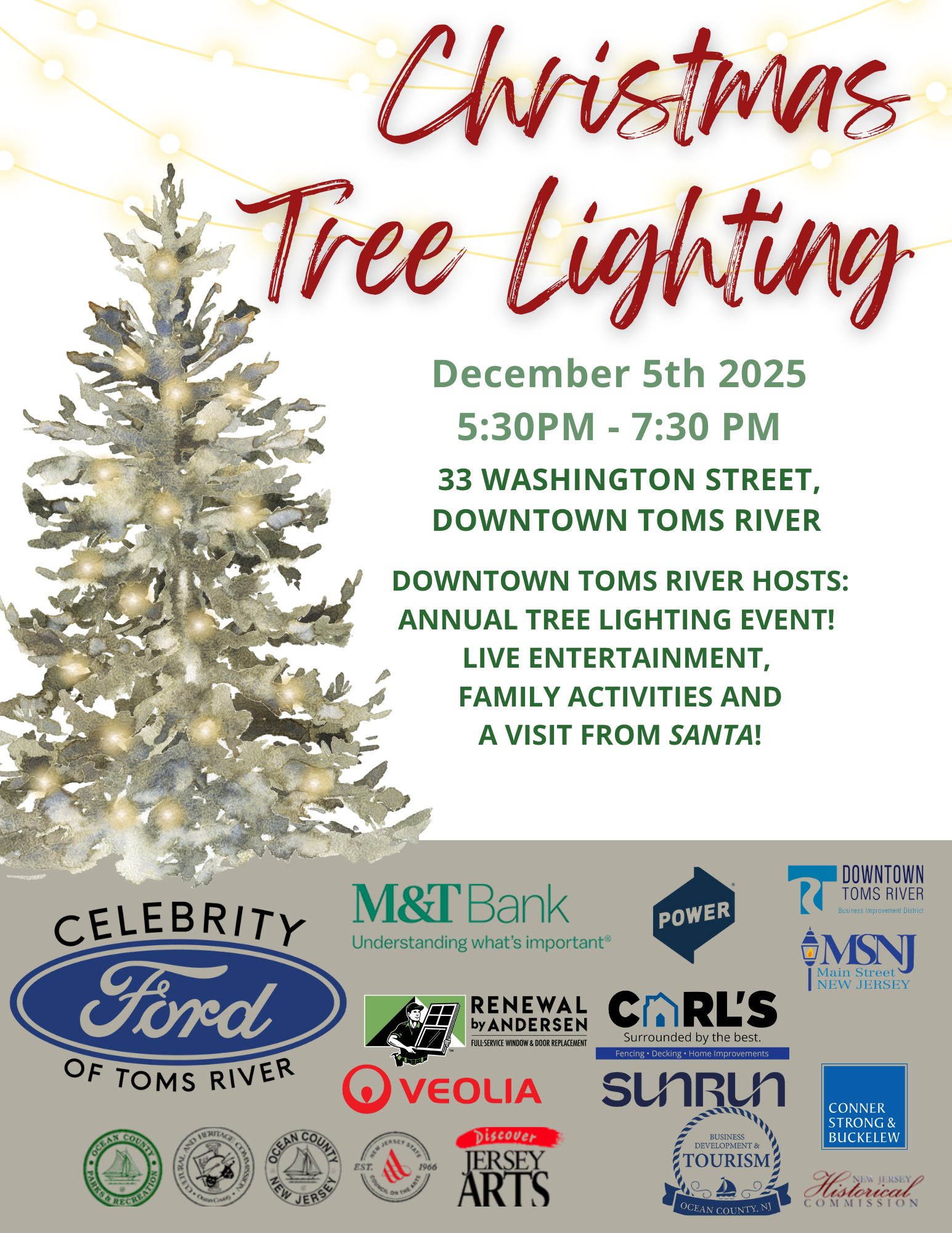 December 5th, 2025: Join us for our annual Christmas Tree Lighting 5:30 PM - 7:30 PM @ 33 Washington St. Downtown Toms River NJ: Live entertainment, Family activities and... SANTA!!