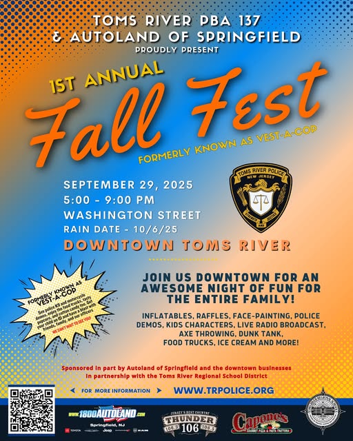FeaturedDowntown Toms River Washington St,., Toms River, NJ, United StatesJoin the Toms River PBA Monday September 29th at 5pm for the first annual Toms River PBA “Fall Fest” For an awesome night of fun for the entire family.