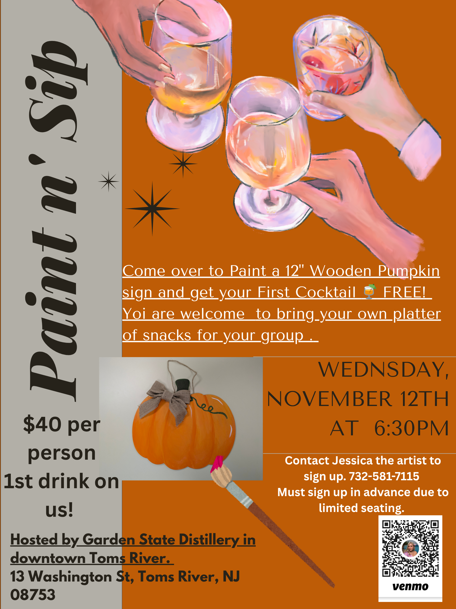 Garden State Distillery 13 Washington Street, Toms River, United StatesAnother fun event Coming to Garden State Distillery! Wednesday November 12th at 6:30pm In downtown Toms River! We will be making these beautiful 12-in wooden pumpkins that come with a bow and a hanging mechanism. 👻🎃🎨🖌️ You'll be taught step by step on how to paint the pumpkin with shading etc. 🍹🍂🎃 And your first alcoholic drink is on us for FREE!! $40 per person painting. If you don't want to paint the pumpkin, there is another option as well, which is this beautiful canvas painting . Just let the artist know which one you'd like to do!! You must sign up for this event in advance due to limited seating. To sign up contact Jessica at "JesSea's Crafty Beaches" Mobile Paint Parties. 732-581-7115