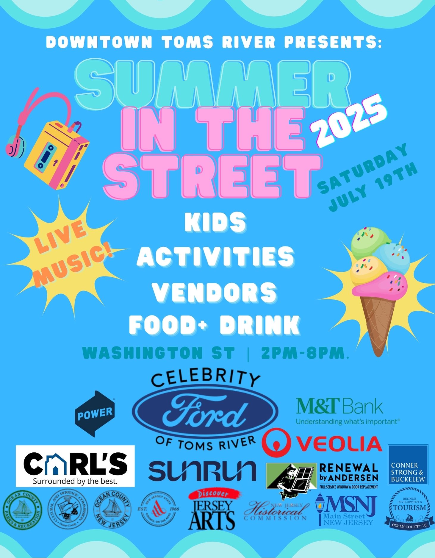 FeaturedDowntown Toms River Washington St,., Toms River, NJ, United StatesJoin us for the hottest event of the summer.. in the street! Come to Downtown Toms River to celebrate fun in the sun! - July 19th 2025 - 2PM - 8Pm on Washington Street - Live bands, demonstrations, food, cold drinks, family fun, activities, crafts, vendors and so much more! - No entry fee! - For more info and events follow us on Facebook www.facebook.com/downtowntomsriver and Instagram www.instagram.com/downtowntomsriver/