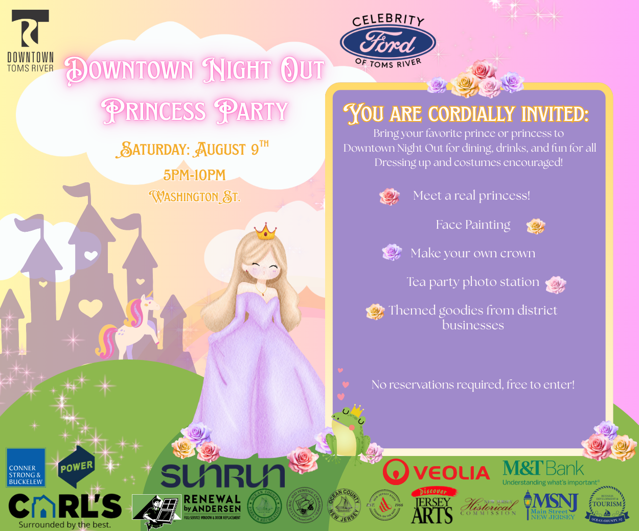 FeaturedDowntown Toms River Washington St,., Toms River, NJ, United StatesJoin us for a very special Downtown Night Out. Dine in the street and bring your favorite prince, pirate, or princess to join! Costumes and gowns are encouraged for guests of all ages.