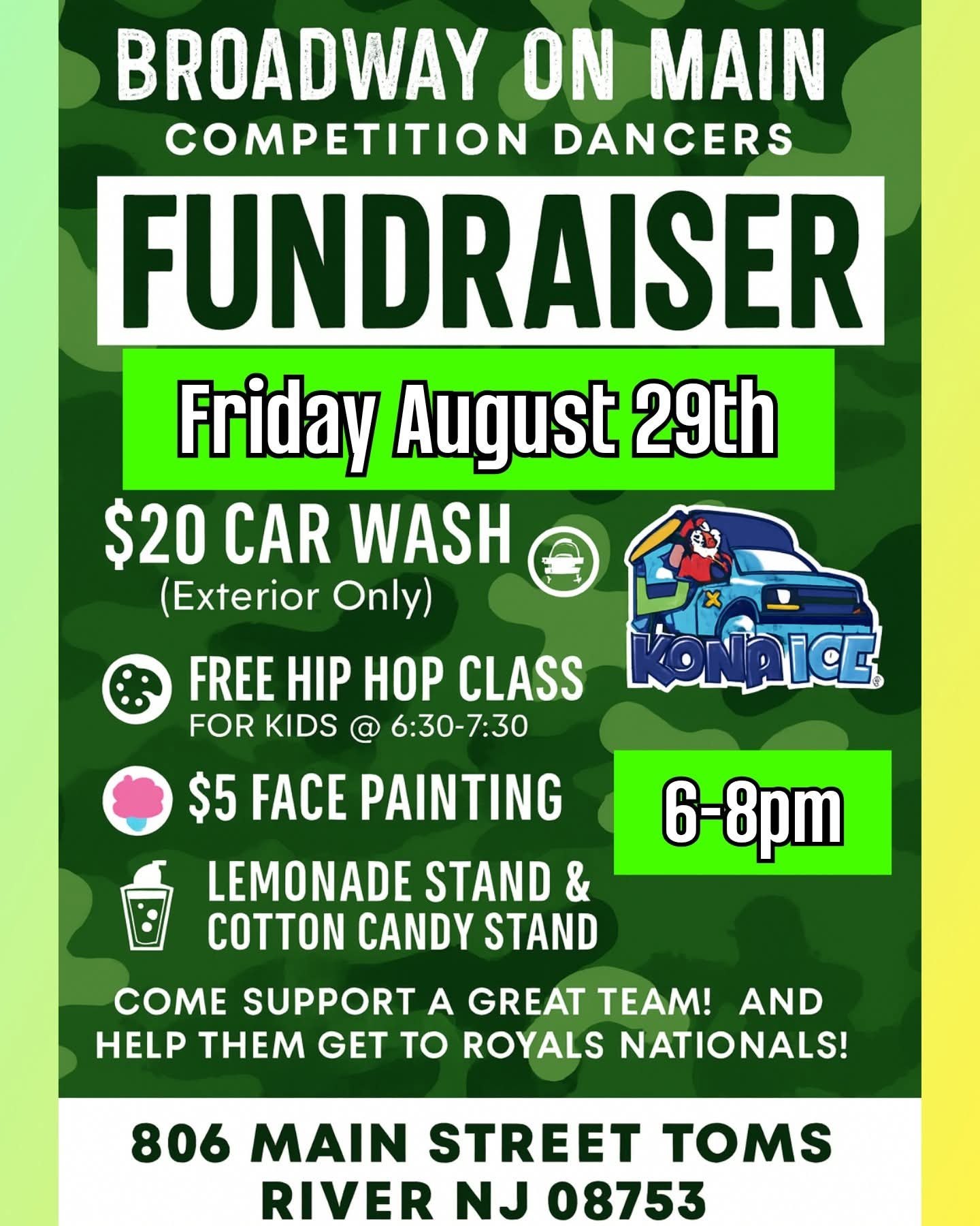 FeaturedBroadway On Main 806 N. Main Street, Toms River, United StatesCar wash fundraiser for Broadway on Main. Cotton candy, face painting, lemonade stand, a free hip-hop dance class for kids!