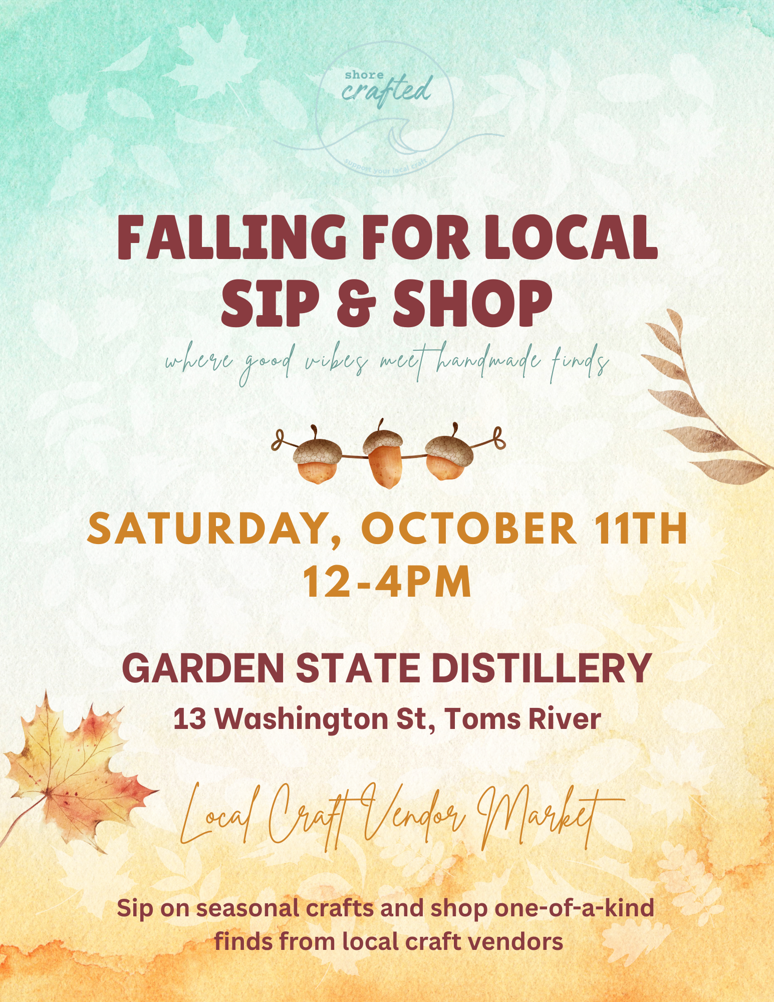Garden State Distillery 13 Washington Street, Toms River, United StatesThis FREE Local Craft & Vendor Market is hosted by Jenn Zazzara, Shore Crafted, bringing together local makers, artisans and small businesses. Enjoy an intimate setting and shop unique, one-of-a-kind items while sipping craft drinks! 🍂🥃Sip & Shop Local Craft & Vendor Market🥃🍂 Crisp air, cozy finds, and handmade vibes. Come sip, shop, and connect with local artisans and small businesses. It’s all about community, creativity, and that perfect fall feeling 🍂🛍️✨ Sip & Shop Vendor Market: Saturday, October 11th | 12-4 pm at Garden State Distillery, 13 Washington Street, Toms River, NJ Swing by–you don’t want to miss this cozy, craft-filled fall vibe! Questions? Contact Jenn Zazzara at shorecraftednj@gmail.com For more details please visit: Falling for Local Sip & Shop | Facebook