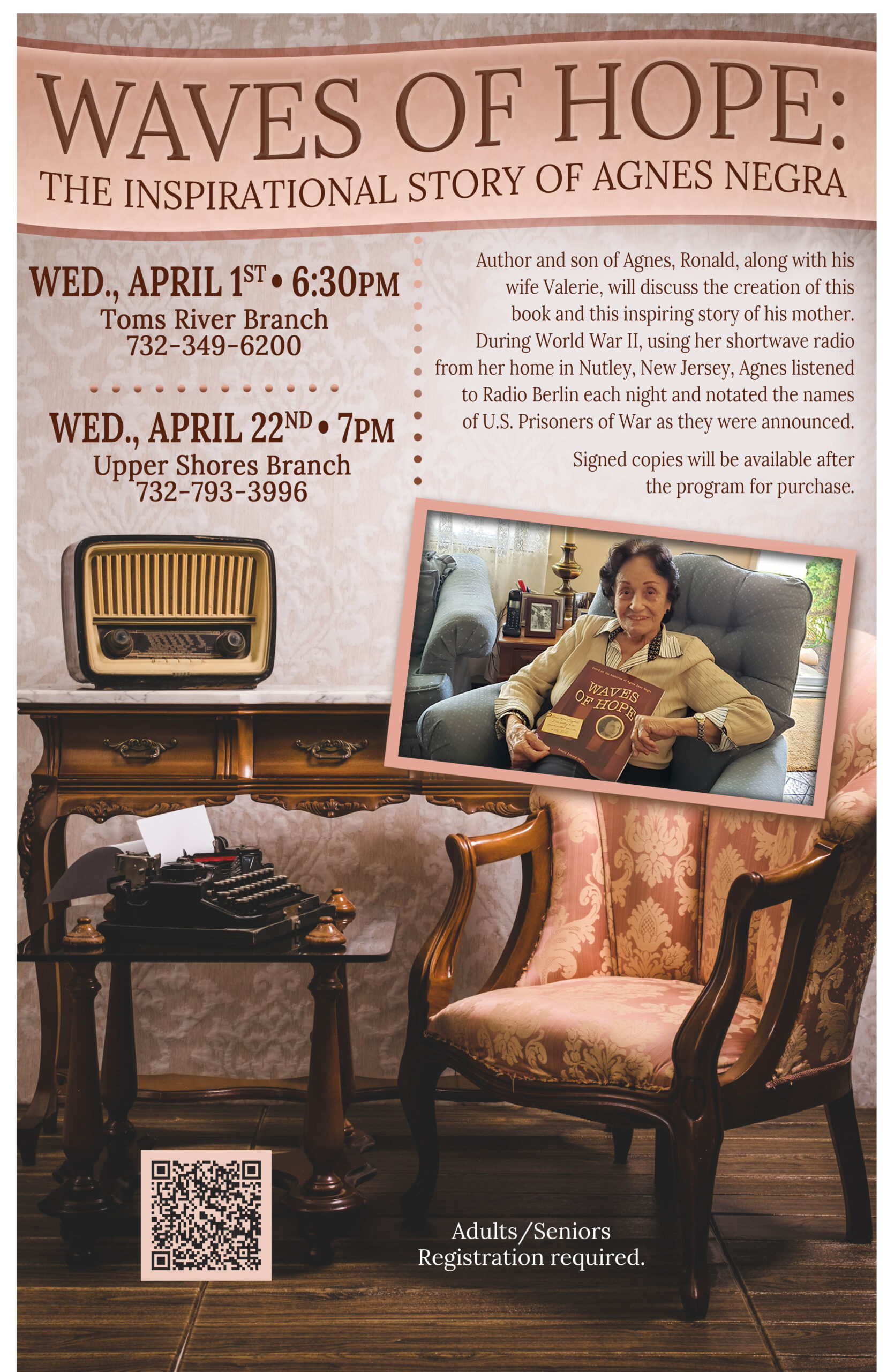 Meet the Author of an Inspiring WWII Tale at Toms River Branch of the Ocean County Library During World War II, a tech-savvy New Jersey woman took it upon herself to be a priceless information provider for families of captured U.S. service members. Agnes Joan Negra’s exploits are chronicled in the book Waves of Hope. Meet her son Ronald Edward Negra, the author, at several branches of the Ocean County Library this April. Ronald and his wife Valerie will discuss his mother’s inspirational tale, lovingly written from her own vivid recollections in Waves of Hope, available at the Ocean County Library. Then as now, parents, spouses, children, and relatives sought any information they could find about their men and women in uniform – whether they were safe, or even alive. This newly married wife and mother was no different. Her husband August suffered wounds in the Battle of the Bulge and was Missing in Action. Sitting by her shortwave radio in her Nutley home, Agnes monitored Radio Berlin’s nightly recitation of captured US military members. She sought news of her husband – but listened for more than that. She began notating all the names. Then she personally contacted the families […]