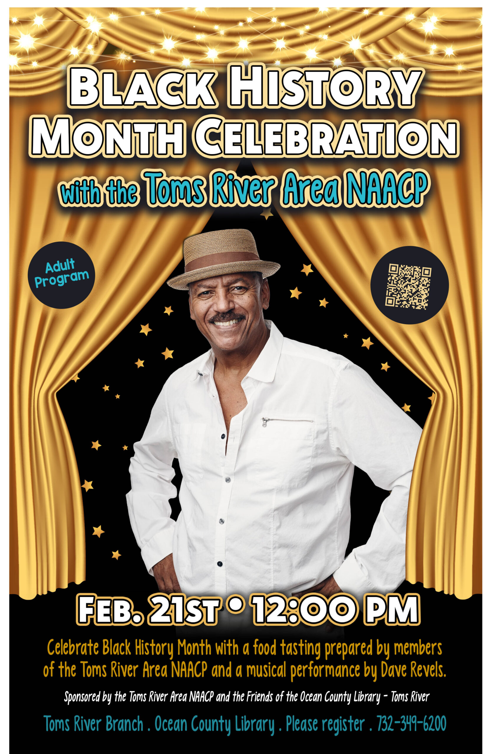 Come celebrate Black History Month with musical entertainment and great food. Celebrate Black History Month with a food tasting* prepared by members of the Toms River Area NAACP and a musical performance by Dave Revels. Dave Revels is a veteran singer, producer, and songwriter known for his work with legendary groups like The Drifters and as lead singer/producer for the acclaimed a cappella group The Persuasions. He has also created the popular Motown tribute show Shadows of the 60s, blending decades of soul, R&B, and classic hits with his own compositions. Mr. Revels has worked across genres (reggae, country, rock, soul) and toured globally. Sponsored by the Toms River Area NAACP and the Friends of the Ocean County Library – Toms River. Please register. *Potential allergens.