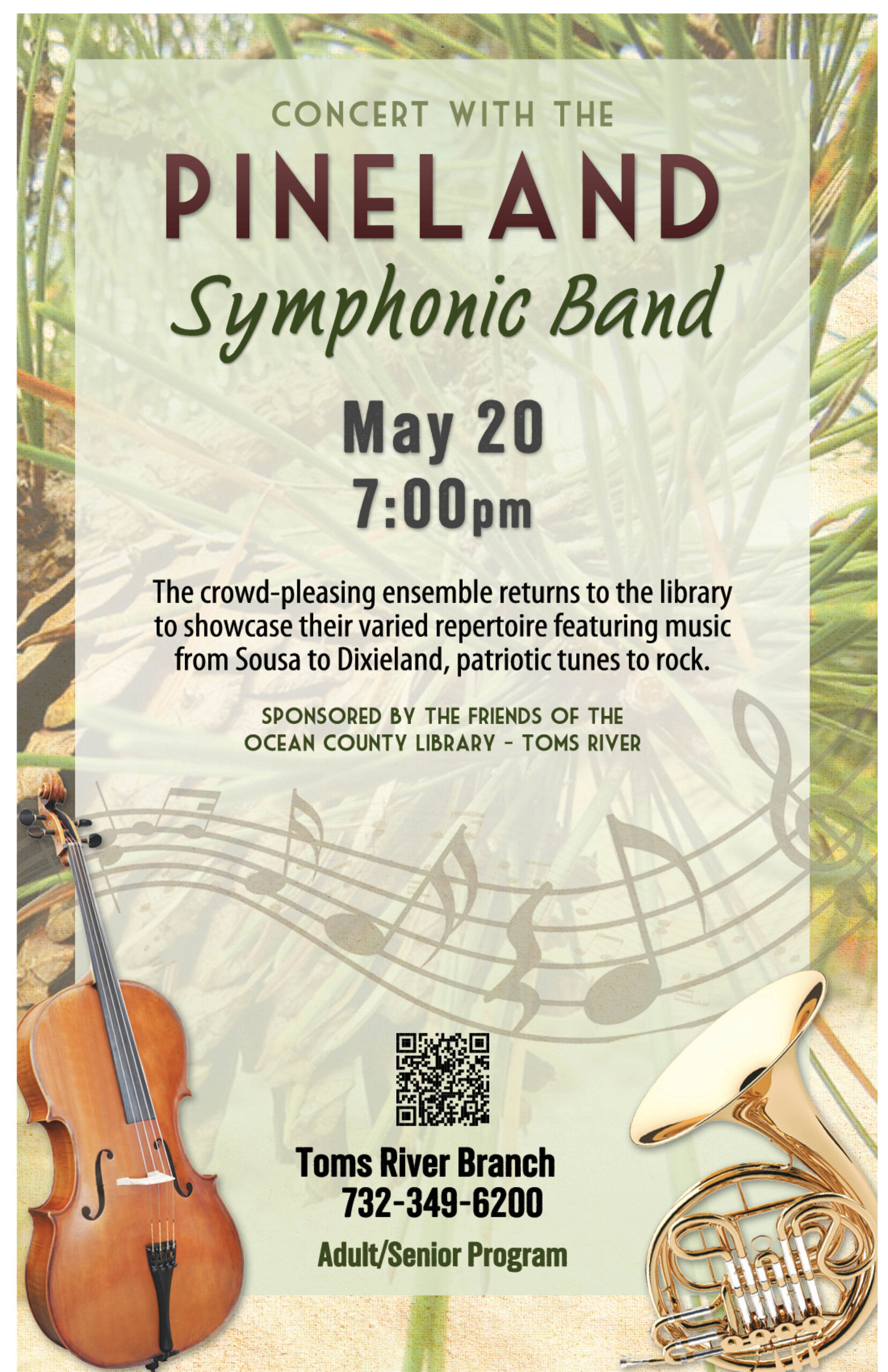 The Ocean County Library 101 Washington St, Toms River, NJ, United StatesThe crowd-pleasing ensemble returns to the library to showcase their varied repertoire featuring music from Sousa to Dixieland, patriotic tunes to rock. Space is limited. First come, first served. This program is sponsored by the Friends of the Ocean County Library – Toms River.