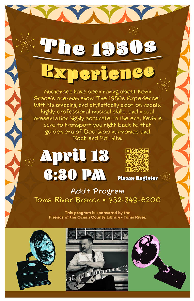 The Ocean County Library 101 Washington St, Toms River, NJ, United StatesCome rock the night away with Kevin Grace's one-man musical performance that will take you back to the Doo-Wop era! Audiences have been raving about Kevin Grace's one-man show "The 1950's Experience". With his amazing and stylistically spot-on vocals, highly professional musical skills, and visual presentation highly accurate to the era, Kevin is sure to transport you right back to that golden era of Doo-Wop harmonies and Rock and Roll hits. This program is sponsored by the Friends of the Ocean County Library - Toms River. Registration is required. Please register at the link.
